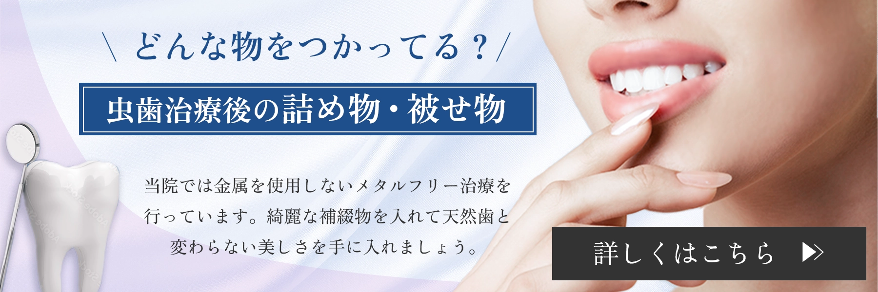 虫歯部分を除去した後、レジン(白い樹脂)や、審美性に優れた材料(セラミックなど)を用いて修復します。