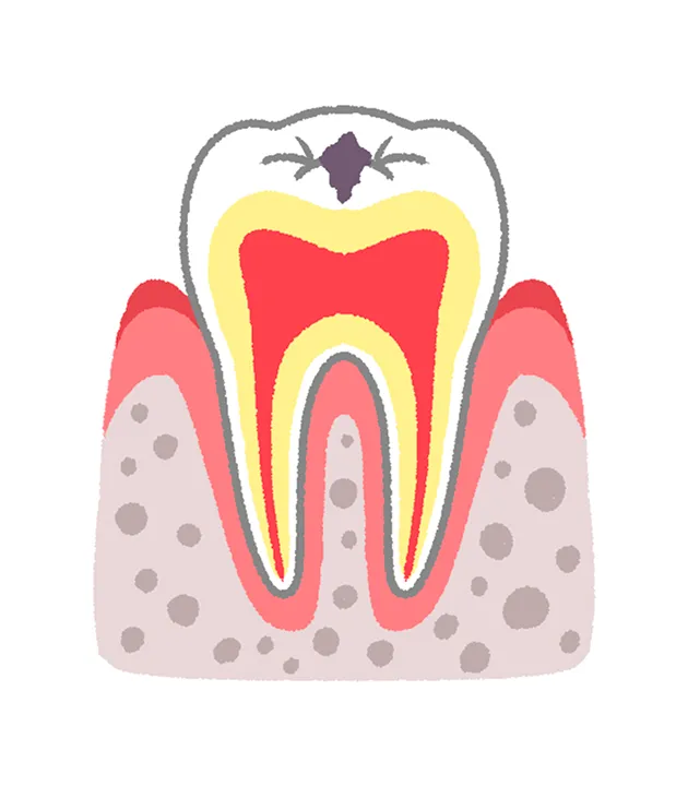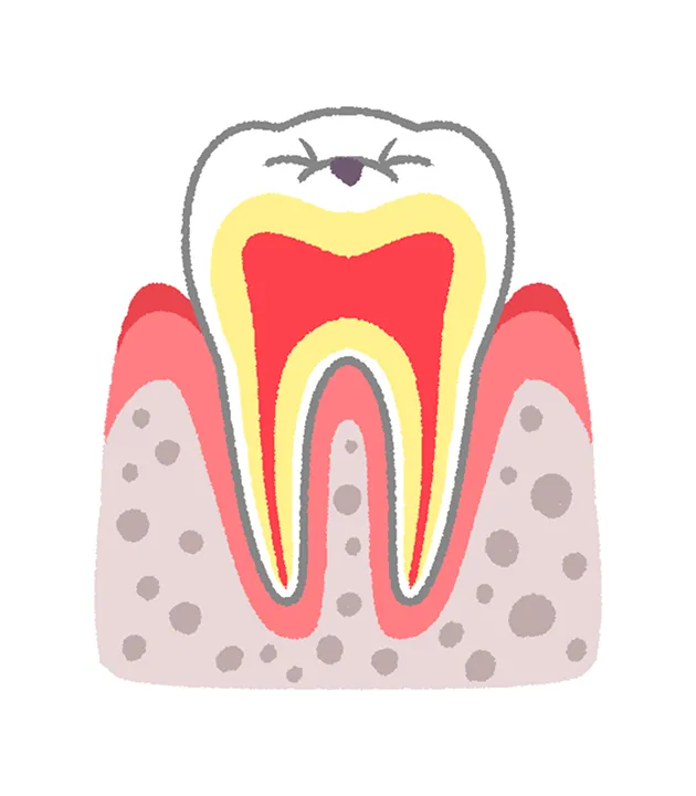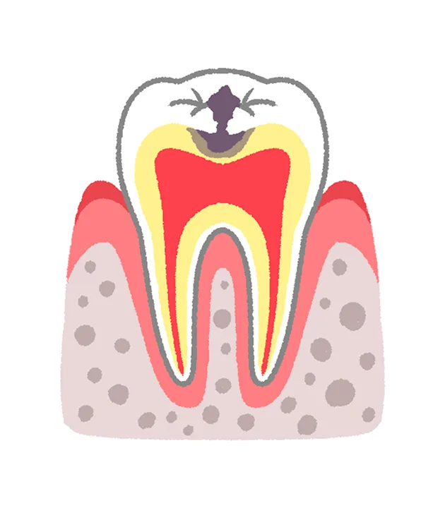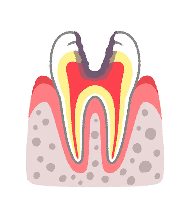 虫歯が歯の根の奥深くまで進行し、歯の神経が壊死している状態です。歯の頭部(歯冠)が大きく崩壊していることも多く、痛みが一時的に和らぐ場合があります。ただし、歯根の先に膿がたまると、再び強い痛みや腫れ、顔の腫脹などの症状が現れることがあります。